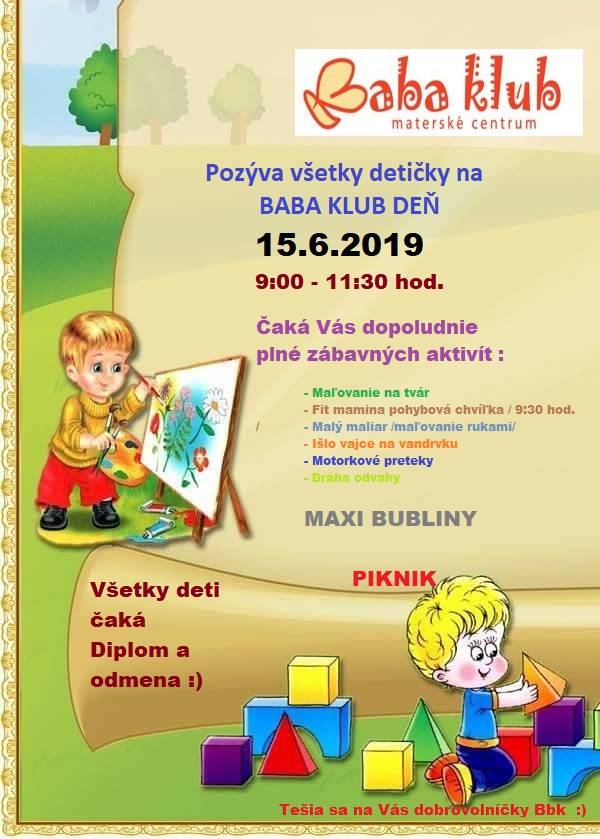 Zábavná sobota v Baba Klube11.6.2019, 04:00OznamMaterské centrum Baba klub pozýva všetky mamičky s deťmi na BABA KLUB DEŇ. Program po kliknutí na čítaj ďalej.Centrum nájdete v Šamoríne v budove daňového úradu na Obilnej ul. 2.Zdieľať: