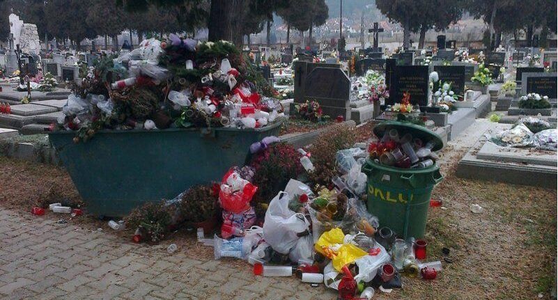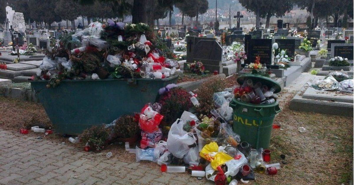 Aj prírodné materiály raz skončia ako odpad. Živé kvety bez plastových obalov, stužiek a drôtikov, kvety z kvetináčov, burinu, lístie či konáriky vytrieďme, aby zbytočne neputovali na skládku. Ak nie sú na cintoríne dostupné nádoby na triedený odpad, vezmime odpad so sebou a vytrieďme ho doma.