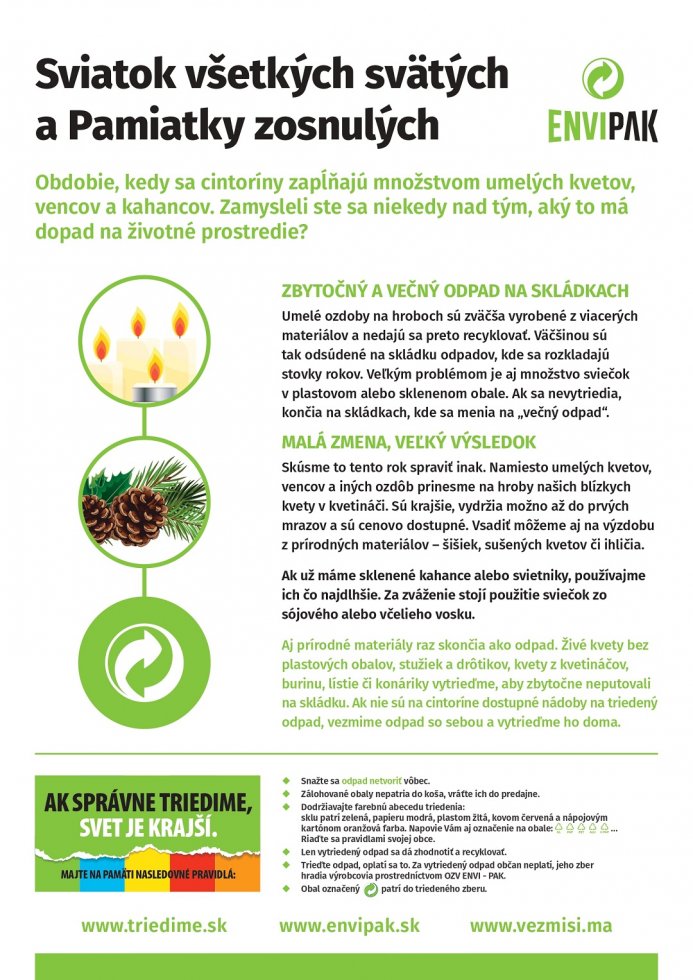 Blíži sa Sviatok všetkých svätých a Pamiatky zosnulých - je to aj obdobie, kedy sa cintoríny zapĺňajú množstvom umelých kvetov, vencov a kahancov. Umelé ozdoby sú väčšinou vyrobené z viacerých materiálov, nedajú sa recyklovať a sú odsúdené na skládku. ENVI - PAK sa rozhodol inšpirovať všetkých, ktorým nie je ľahostajné triedenie odpadu. Zaspomínať si na našich blízkych je možné aj s prihliadnutím na životné prostredie, správnym triedením odpadu a predchádzaním tvorby odpadu.