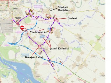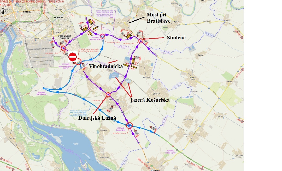 • Všetky vozidlá z Bratislavy pôjdu po ulici Odeská a následne na cestu II/572A, kde môžu prejsť na diaľnicu D4 alebo pokračovať po ceste III/1053 do Dunajskej Lužnej.