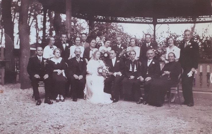 Sobášna fotka z roku 1935 zachytávajúca rodinu Jánosa Domsitza. Jeho dcéra Matilda ako nevesta, Lajos Gyulai ako ženích  (Zdroj: Somorjai lakosok régi képei)