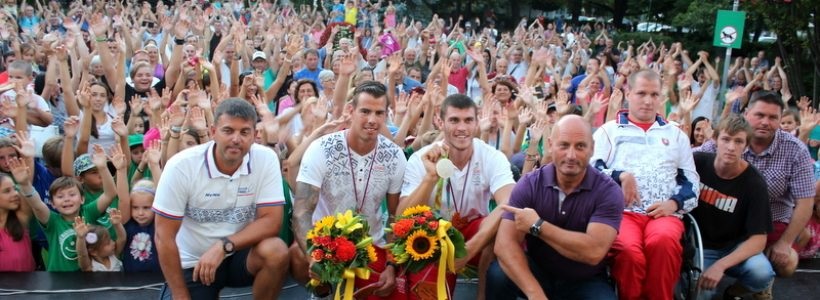 Takto pompézne privítali Šamorínčania návrat olympionikov z Ria. Zľava reprezentačný tréner Marián Tesárik, Vincent Farkas, Tibor Linka, tréner Gejza Vass, paralymionik Jakub Nagy so svojím asistentom a bývalý olympionik, súčasný primátor Csaba Orosz (Zdroj: samorin.sk)