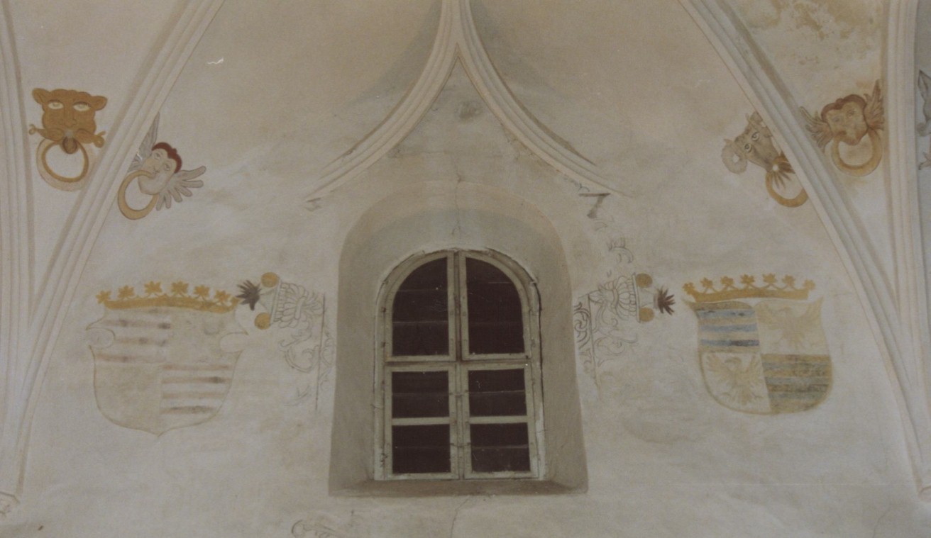 Erb kráľa Vladislava II. na južnej stene hlavnej lode (orlica vpravo), vľavo pruhy Arpádovcov (1. a 4. pole) a český lev (2. a 3. pole), 1499