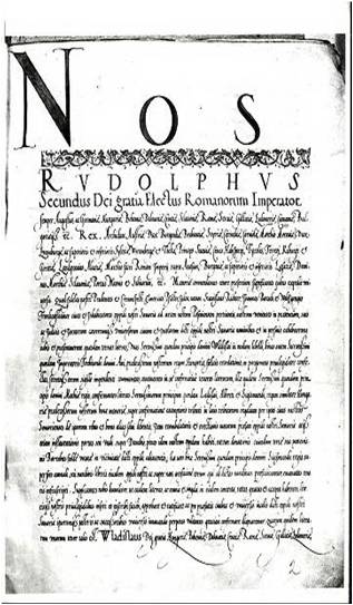 Listina Rudolfa II. potvrdzujúca platnosť predtým vydaných listín. Obyvateľov Šamorína oslobodzovala od platenia mýta, no súčasne im ukladala povinnosť odvádzať zemepanskú daň, ako aj ďalšie poplatky.