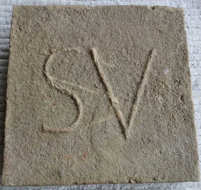 Tehla z pôvodného domu na Gazdovskom rade č. 34. Nesie iniciály SV - Somorja Város (Zdroj: rodina Hargašová)
