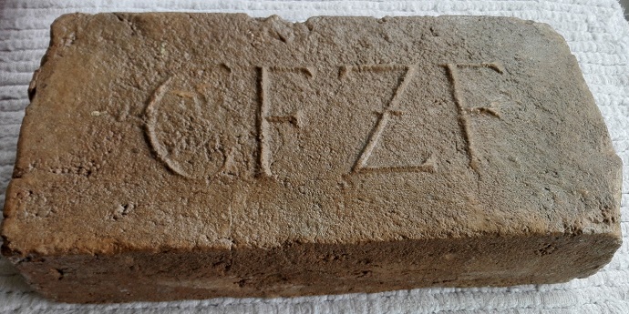 Tehla z pôvodného domu na Gazdovskom rade č. 34. - nesie iniciály majiteľov domu - Caroly Frank, Zsuzsana Frank (Zdroj: rodina Hargašová)