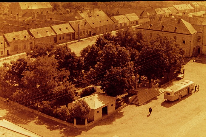 Nový režim priniesol mnohé zmeny. Zmizla časť Alžbetínskej záhrady, aby tam mohol vyrásť sovietsky pamätník. Vedľa vľavo postavili čakáreň autobusovej zastávky. Rad domov v pozadí dnes už nestojí. V pozadí dom Ješkovcov, Jána Laposa, dielňa a dom stolára Somorjaiho a evanjelická fara