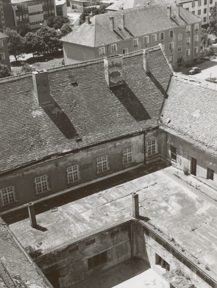 Nádvorie bývalého kláštora ešte s pristavanými budovami, stav v roku 1995