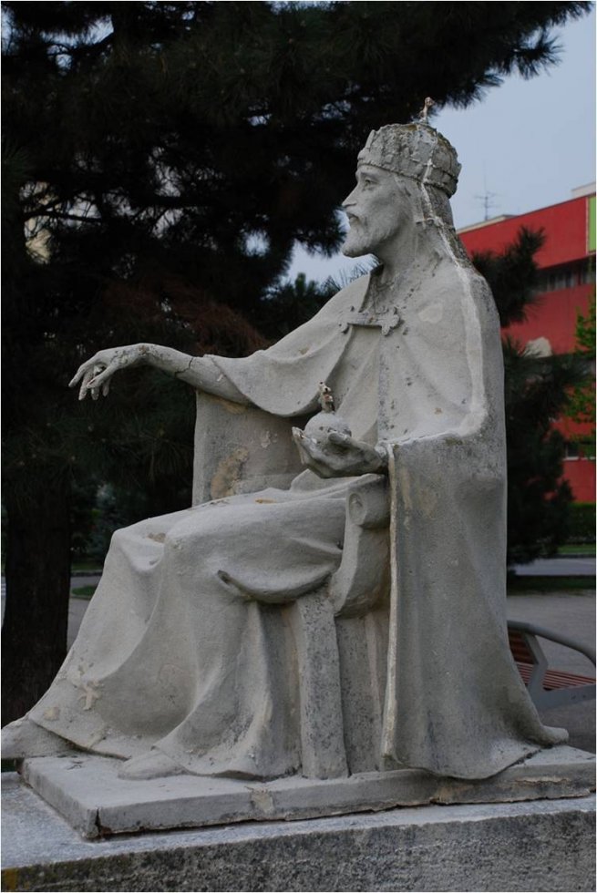 V parčíku pred Mestským kultúrnym strediskom stráži nedotknuteľnosť kultúrneho stánku socha sv. Štefana s mečom v ruke