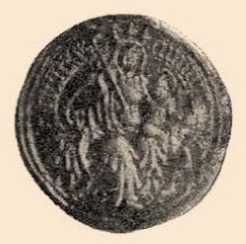 Najstaršia pečať mesta Šamorín s nápisom S/igillum/ * ciuitat/is/ * samarie * mi/nus/* a vyobrazením Panny Márie s Božím synom na kolenách