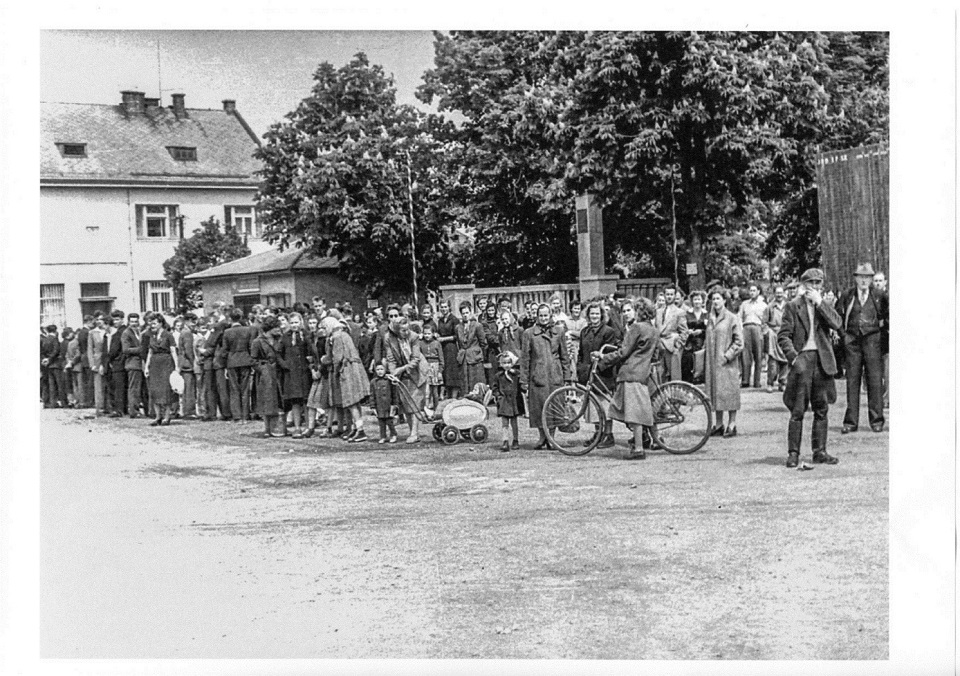 Všadeprítomná budovateľská atmosféra, typický obraz 50-ych rokov. Vľavo čakáreň autobusovej stanice (Zdroj: Somorjai lakosok régi képei, Gábor Szinghoffer)