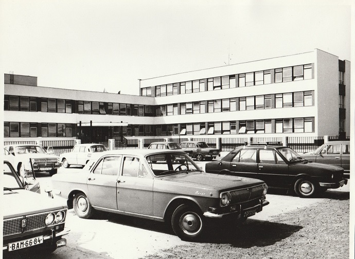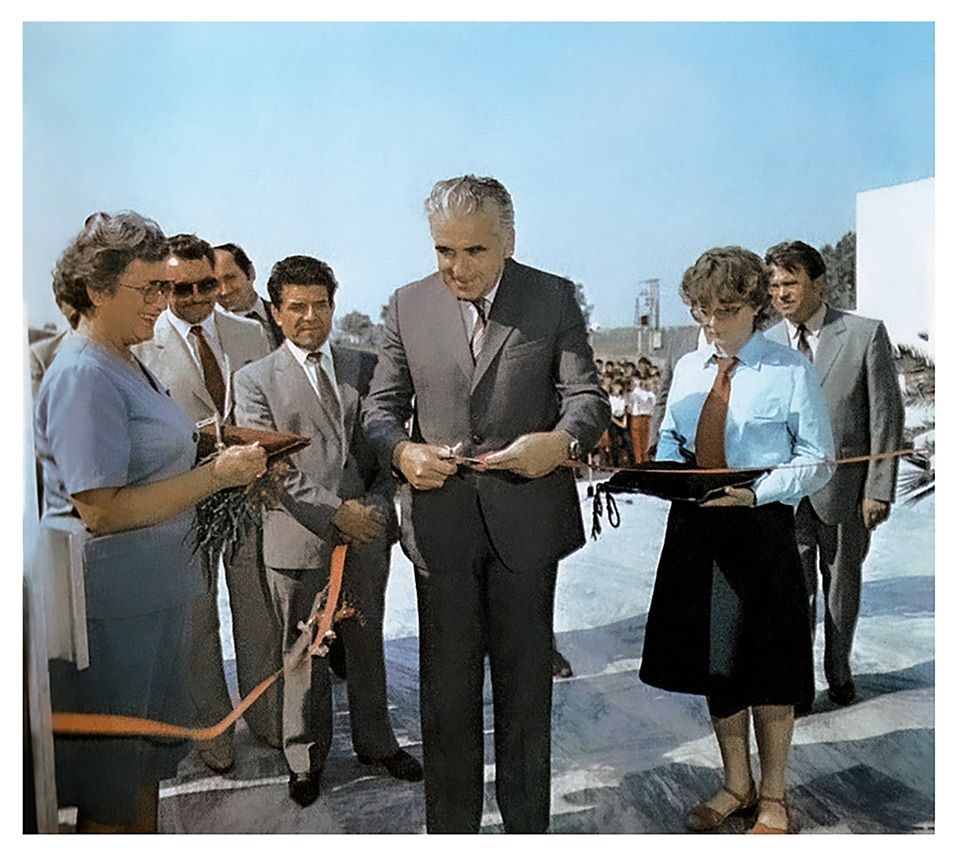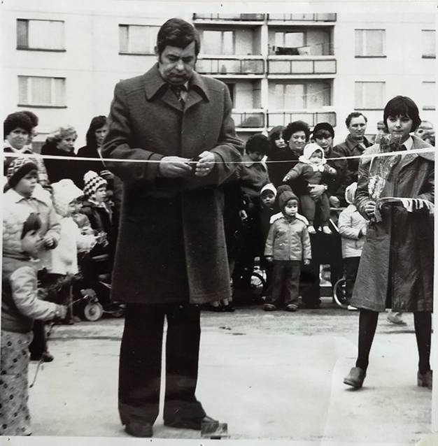 Slávnostné prestrihávanie pásky pri odovzdávaní novej budovy slovenského a maďarského gymnázia. V strede Dezider Krocsányi, minister práce a sociálnych vecí SSR, zľava JUDr. Nina Lefflerová, riaditeľka gymnázia, za ňou Kálmán Dudás, Vincent Magyarics, vpravo Tibor Orosz, riaditeľ gymnázia s vyučovacím jazykom maďarským