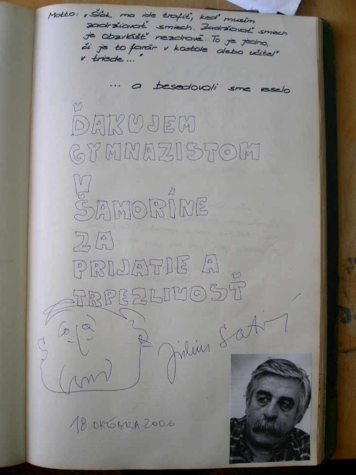 Julo Satinský sa takto svojrázne zvečnil na stránkach školskej kroniky, ktorá je pokračovaním kroniky bývalej meštianky