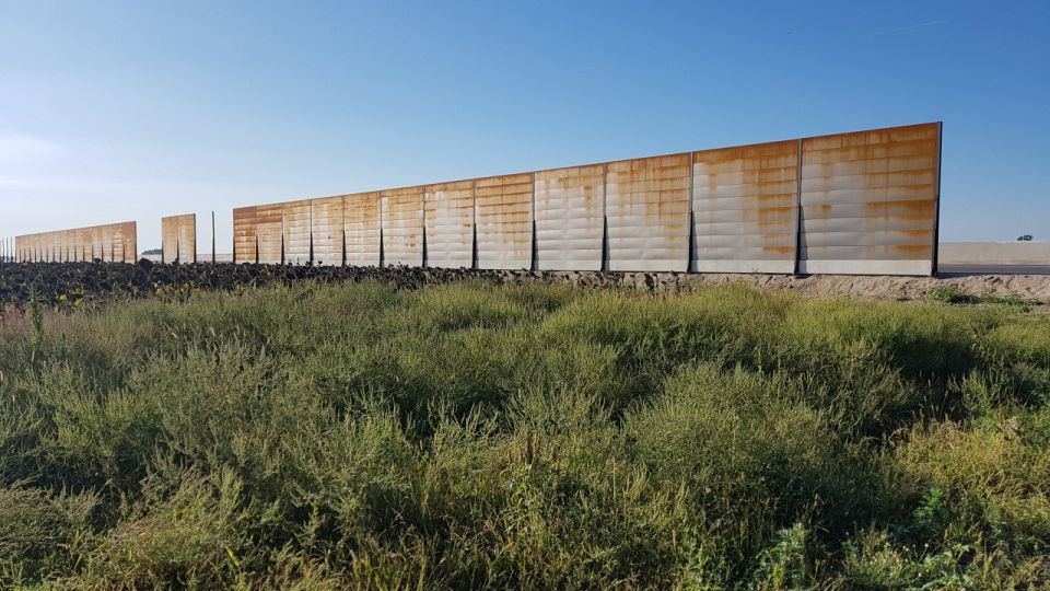 Akustické steny boli realizované modulárnymi panelmi zo samoochrannej ocele, často označovanej ako „zvetraná oceľ“, alebo oceľ COR-TEN. Zvetraná oceľ je vysokopevná oceľ s nízkym obsahom iných kovov a jej chemické zloženie podporuje skorú tvorbu priľnavej ochrannej vrstvy hrdze pri vystavení prvkom, ktoré zaisťujú vyššiu úroveň odolnosti voči poveternostným vplyvom v porovnaní s inými typmi ocele.