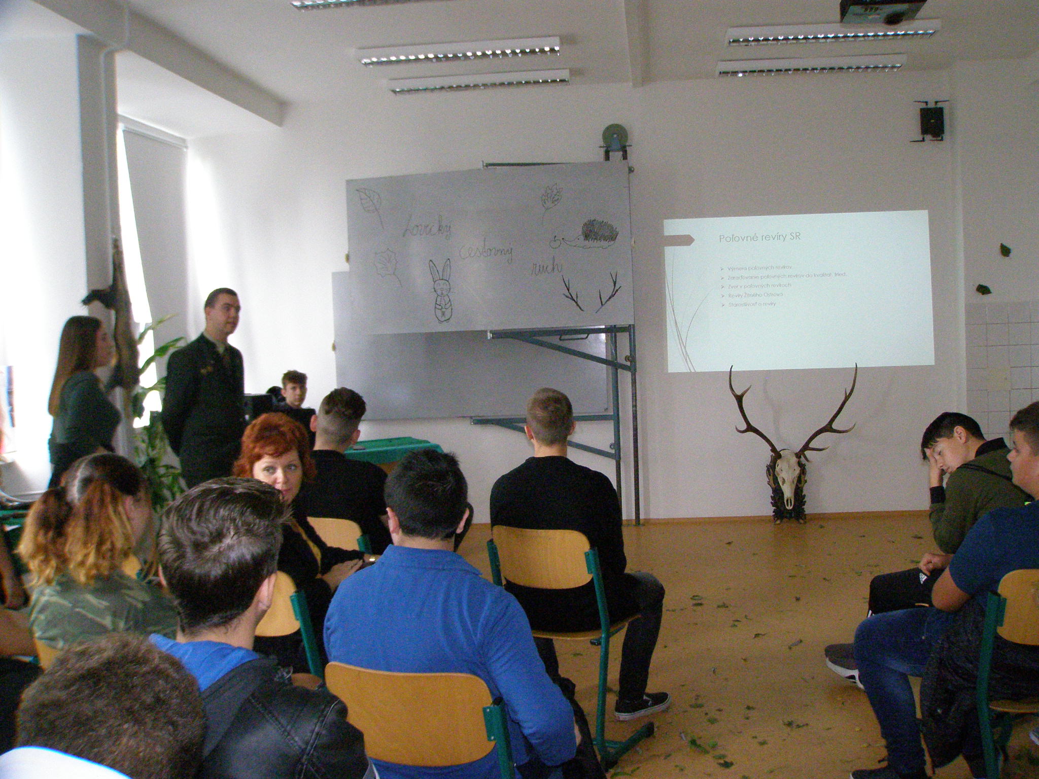 Druhá téma, určená hlavne pre chlapcov, bola rovnako pútavá: Lovecký cestovný ruch. Aj tentoraz sa podarilo v miestnosti navodiť atmosféru prezentovanej témy - lesa. Dekorovali ju jelenie trofeje, rôzne vábničky na lov jeleňov, diviakov, srncov i kačíc. Dokonca aj podlaha obsypaná jesenným lístím mala pripomínať lesný chodníček. Niekoľko chlapcov si mohlo na školskom dvore vyskúšať streľbu zo vzduchovky. Sme radi, že naše pozvanie prijal aj náš bývalý žiak Dominik Culka, ktorý má s poľovníctvom bohaté skúsenosti. Prezentoval lovecký cestovný ruch na území Slovenska i Maďarska a priebeh poľovačky od jej rezervácie, až po vydanie trofejí. O tom, že publikum téma zaujala, svedčilo množstvo otázok.