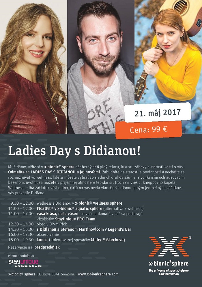 Je to deň iba pre vás. Zoberte svoje kamarátky a príďte si do x-bionic® sphere užiť wellness, oddych, humor a krásu. Párty môžete mať aj cez deň, tak zahoďte starosti a príďte sa zabaviť v spoločnosti veselých dám s Didianou a jej hosťami. Tešíme sa na vás v x-bionic® sphere.