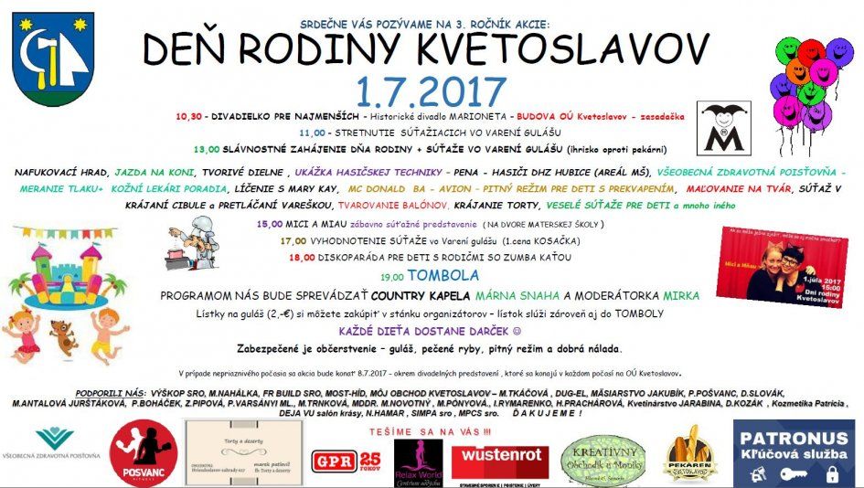 Už 3. ročník podujatia  Deň rodiny sa uskutoční 1.7. v Kvetoslavove. Čaká Vás kopec zábavy,  darčeky a občerstvenie.