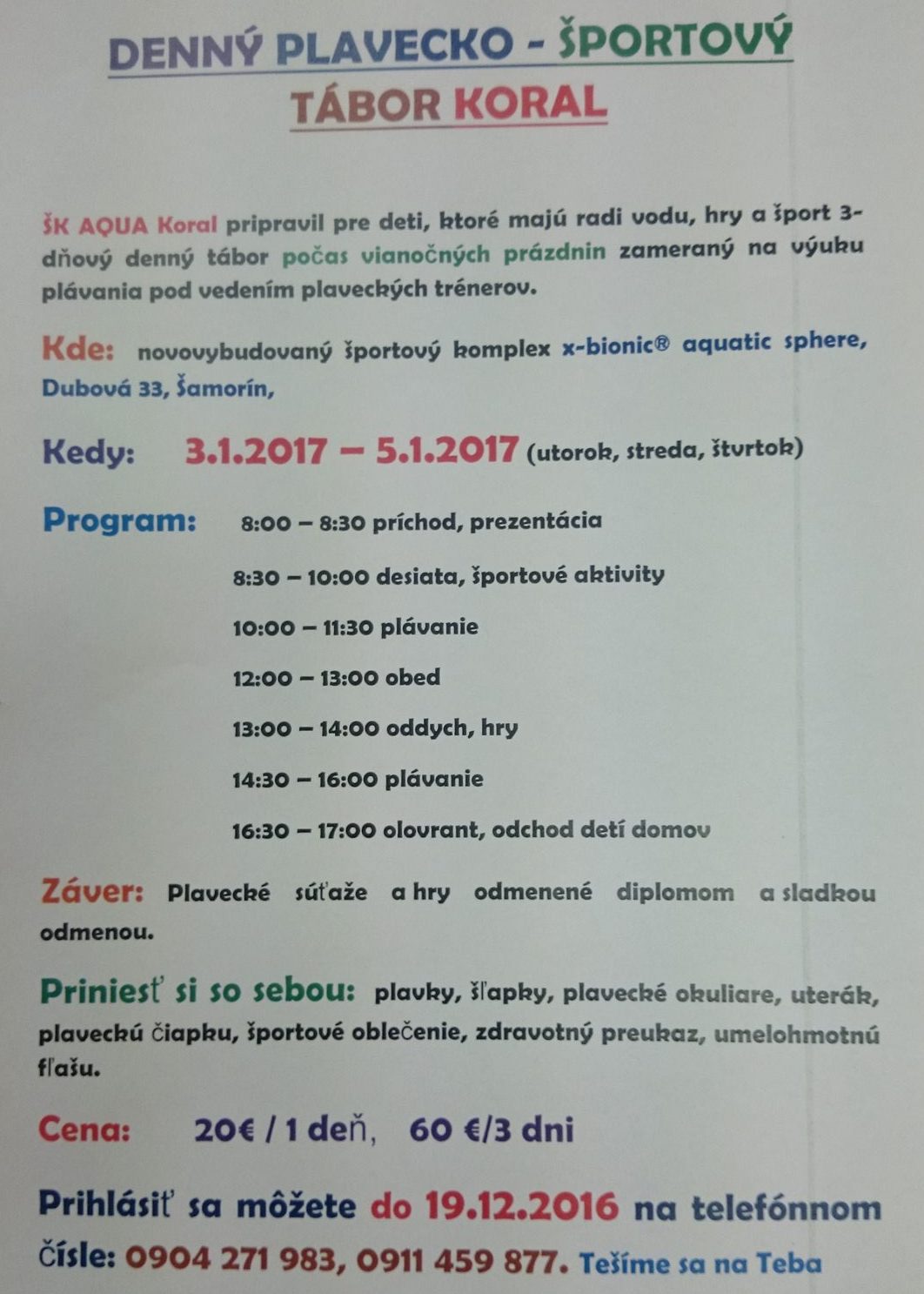 ŠK AQUA Koral pripravil pre deti, ktoré majú radi vodu, hry a šport 3-dňový denný tábor, ktroý sa uskutoční počas vianočných prázdnin. Tábor je zameraný na výuku pod vedením plaveckých trénerov.
