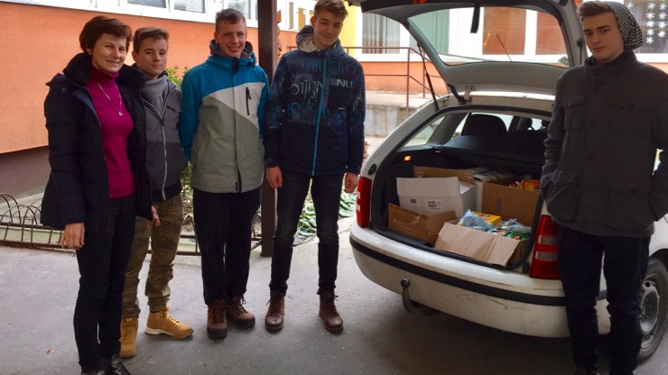 Pani riaditeľka ZŠ Mátyása Gabriella Bugárová a deviataci. Chlapci ochotne ponosili zozbierané trvanlivé potraviny a hygienické potreby do auta.