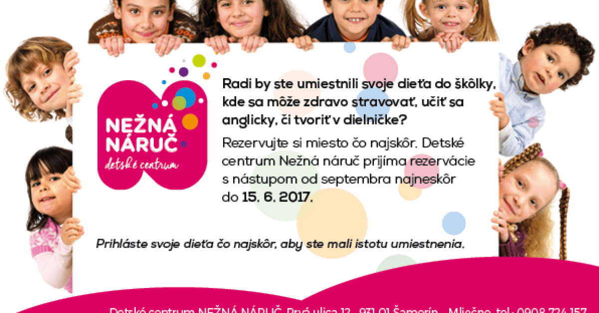 Keďže sa miesta rýchlo zapĺňajú, využite ešte posledné dni na prihlášku svojho dieťaťa do súkromnej materskej školy Detské centrum Nežná náruč, v Šamoríne, časť Mliečno.