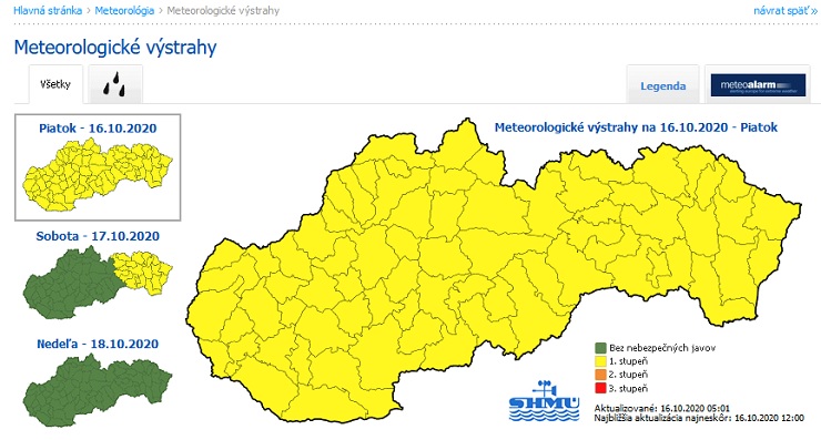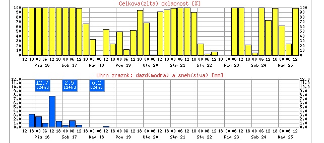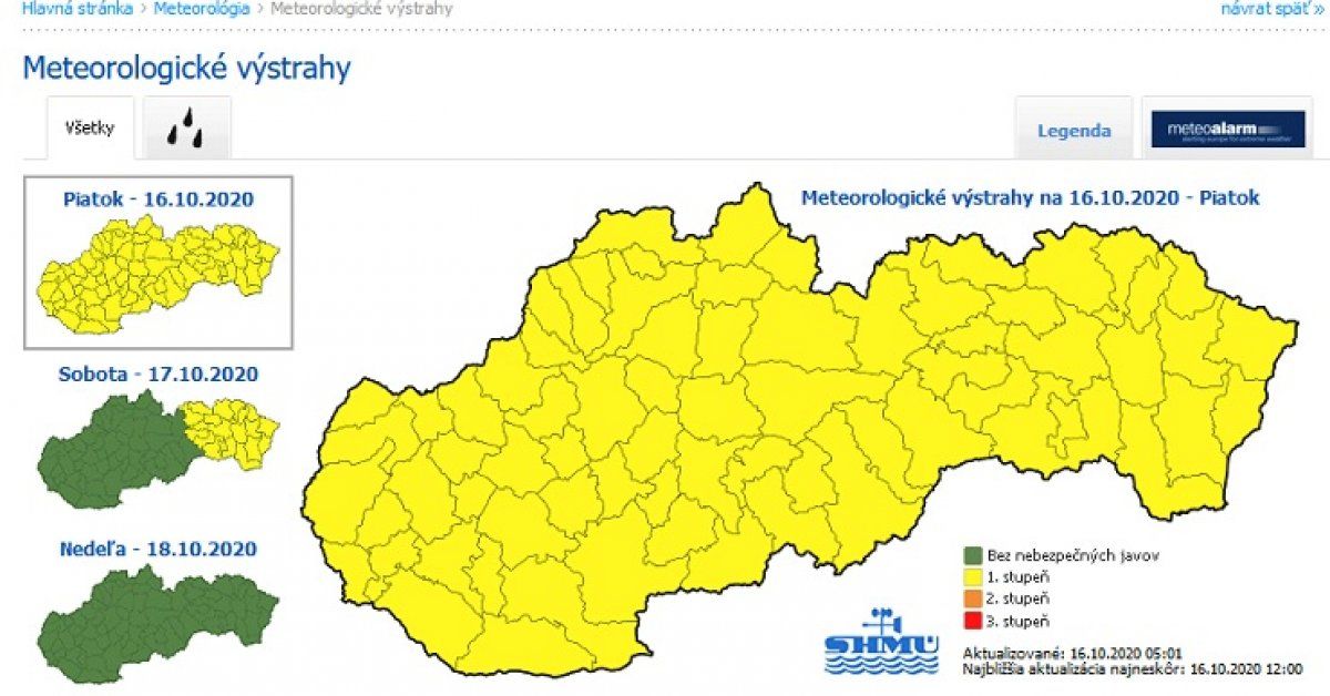 Dnes bude oblačno až zamračené a na mnohých miestach dážď, prehánky, vo vysokých polohách sneženie. Ojedinele aj výdatné zrážky. Denná teplota vystúpi na 6 až 15 stupňov. Pre celé územie Slovenska platí výstraha prvého stupňa pred dažďom.