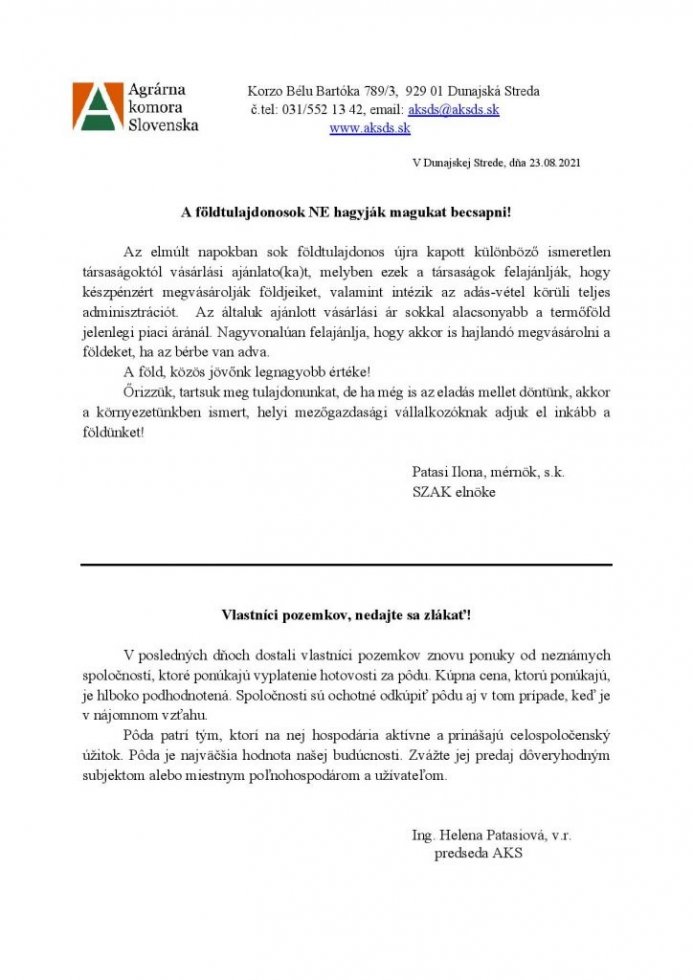 Riaditeľka Agrárnej komory Slovenska so sídlom v Dunajskej Strede, Ing. Helena Patasiová sa obrátila na majiteľov pozemkov s výzvou, aby sa nedali zlákať neznámymi spoločnosťami, ktoré ponúkajú zdanlivo výkup pôdy v hotovosti za zdanlivo výhodnú cenu.