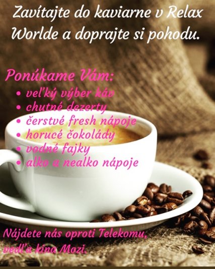 Relax World Kaviareň je otvorená v pondelok až štvrtok a v nedeľu od 8. do 21. hodiny a v sobotu od 8. do 23. hodiny.