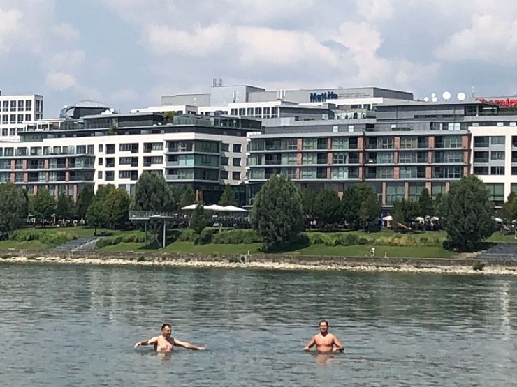 Ľudia sa kúpu v Dunaji v Bratislave počas nízkej hladiny