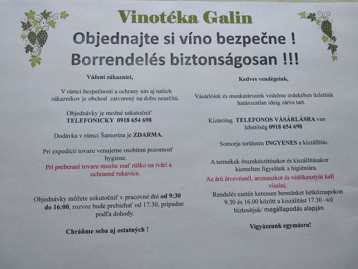 Vinotéka Galin: Objednajte si víno bezpečne7.4.2020, 10:35OznamVinotéka Galin Vám ponúka možnosť telefonickej objednávky vína. Vyzdvihnúť si ho môžete pred predajňou na Školskej ulici č. 41. Jeho rozvoz je však v rámci Šamorína zadarmo. Podrobnosti nájdete v plagátiku.Zdieľať: