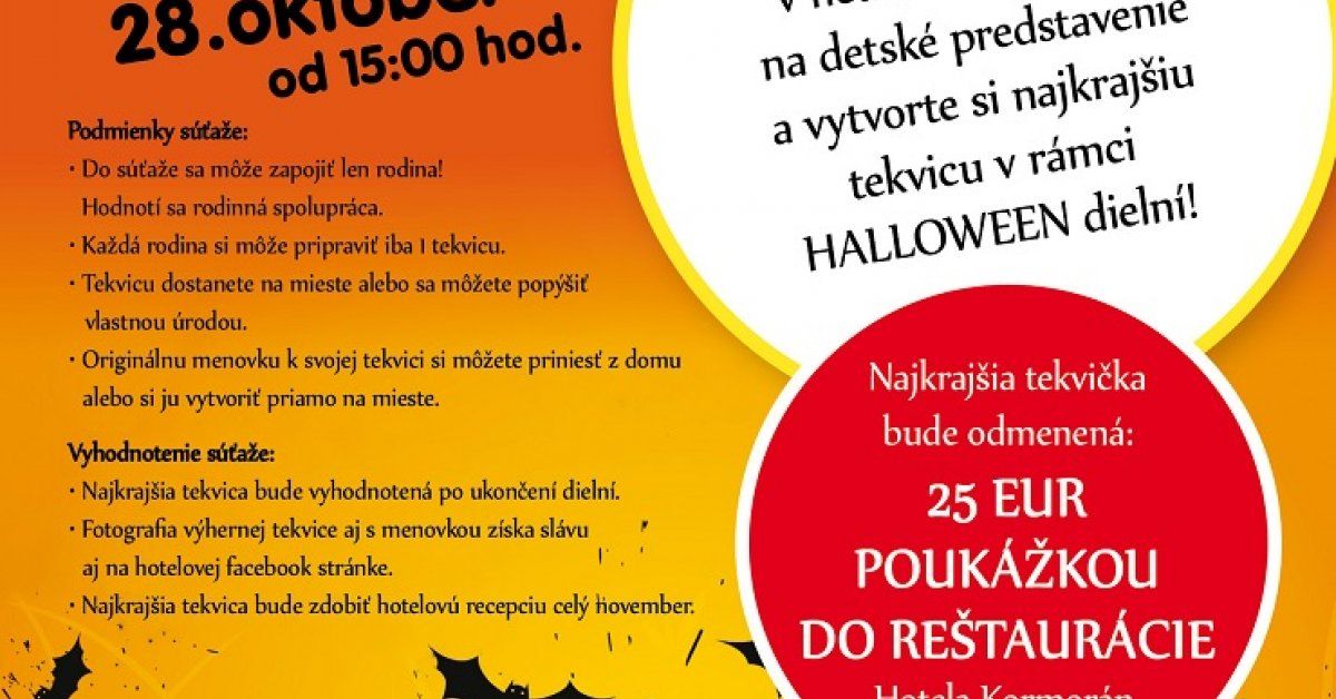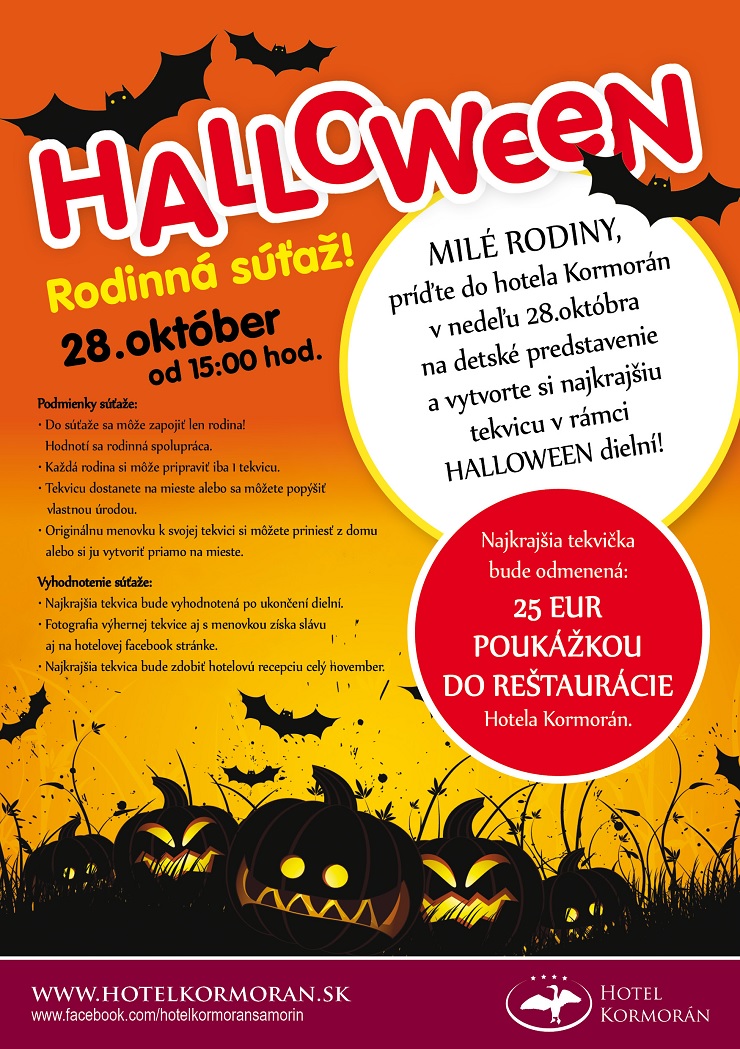 Jeseň nám už začala. A s ňou k nám prichádza aj halloween. A preto je pre vás pripravený halloweenský program. Pre deti sú pripravené tvorivé dielne, kde si môžu spolu s rodičmi vyrezať svoju vlastnú halloweenskú tekvičku, alebo si vyrobiť halloweenské pavúčiky a mnoho iného. Príďte a zažite pravú halloweensku atmosféru v Hoteli Kormorán.