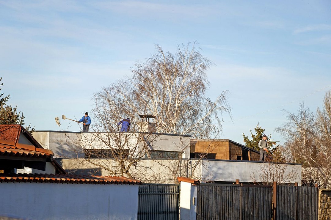 Chlapi na fuške pre celebritu ostošesť fúrikovali štrk, ktorým je pokrytá celá strecha. Na záberoch je vidieť, že fólia, prípadne asfaltové pásy sú odhrnuté a prebehlo tam pátranie po zdroji problémov.
