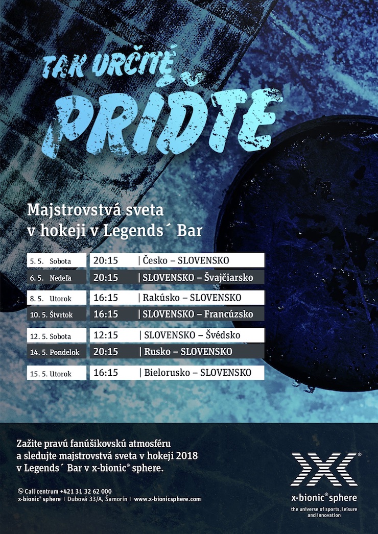 Hokejový šampionát v Legends′ Bar3.5.2018, 14:02OznamZažite pravú fanúšikovskú atmosféru a sledujte majstrovstvá sveta v hokeji 2018 v Legends ́ Bar v x-bionic® sphere.Podrobný program: Zdieľať: