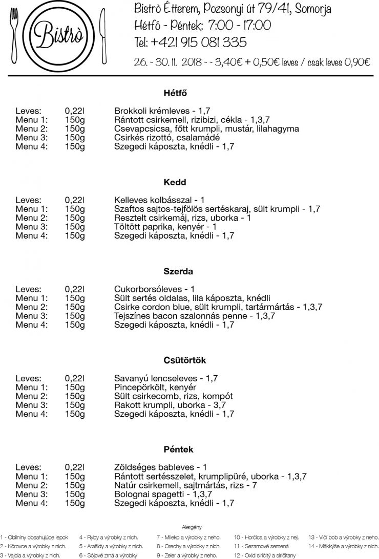 Ebéd menüA Bistrò étterem ebéd menüje: november 26-tól 30-ig2018.11.26. 07:46Peter GáborA Bistrò étterem heti ebéd menüje.Megosztás:Hasonló cikkek A Bella Italia Pizzéria étterem ebéd menüje: december 17-től 21-ig2019.6.17. 06:02 A Pisti konyhája étterem ebéd menüje: december 17-től 21-ig2019.6.17. 06:00 A SAFARI PUB & RESTAURANT étterem ebéd menüje: december 17-től 21-ig2018.12.16. 20:56 A Bistrò étterem ebéd menüje:december 17-től 21-ig2018.12.16. 20:47 A SAPA vietnami bisztró ebéd menüje: december 17-től 23-ig2018.12.16. 20:34 A Bella Italia Pizzéria étterem ebéd menüje: november 26-tól 30-ig2018.11.26. 07:50