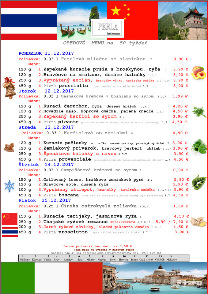 Ebéd menüA Perla étterem ebéd menüje: december 11-től 15-ig2017.12.11. 07:17Peter GáborPerla étterem heti ebéd menüje:Megosztás:Hasonló cikkek A Bella Italia Pizzéria étterem ebéd menüje: december 17-től 21-ig2019.6.17. 06:02 A Pisti konyhája étterem ebéd menüje: december 17-től 21-ig2019.6.17. 06:00 A SAFARI PUB & RESTAURANT étterem ebéd menüje: december 17-től 21-ig2018.12.16. 20:56 A Bistrò étterem ebéd menüje:december 17-től 21-ig2018.12.16. 20:47 A SAPA vietnami bisztró ebéd menüje: december 17-től 23-ig2018.12.16. 20:34 A Bella Italia Pizzéria étterem ebéd menüje: november 26-tól 30-ig2018.11.26. 07:50
