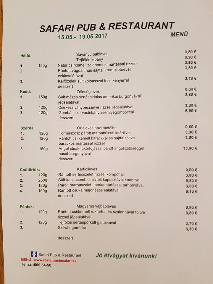Ebéd menüA SAFARI PUB & RESTAURANT étterem ebéd menüje: május 15-től 19-ig2017.5.14. 19:26Peter GáborSAFARI PUB & RESTAURANT étterem heti ebéd menüje:Megosztás:Hasonló cikkek A Bella Italia Pizzéria étterem ebéd menüje: december 17-től 21-ig2019.6.17. 06:02 A Pisti konyhája étterem ebéd menüje: december 17-től 21-ig2019.6.17. 06:00 A SAFARI PUB & RESTAURANT étterem ebéd menüje: december 17-től 21-ig2018.12.16. 20:56 A Bistrò étterem ebéd menüje:december 17-től 21-ig2018.12.16. 20:47 A SAPA vietnami bisztró ebéd menüje: december 17-től 23-ig2018.12.16. 20:34 A Bella Italia Pizzéria étterem ebéd menüje: november 26-tól 30-ig2018.11.26. 07:50