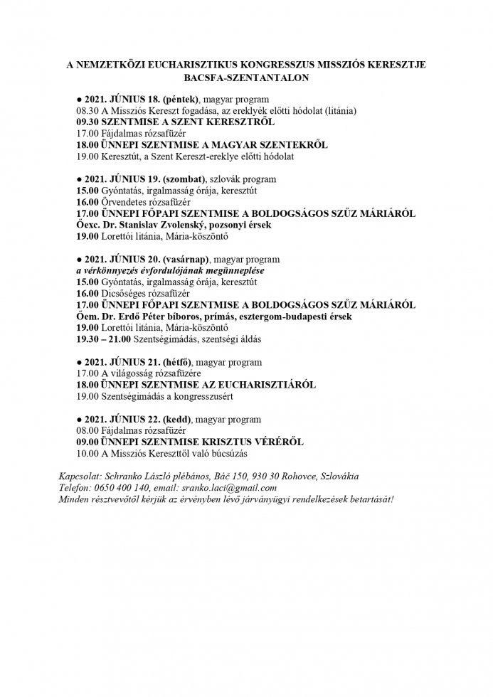 Június 18-án Bacsfa-Szentantalra érkezik a Nemzetközi Eucharisztikus Kongresszus missziós keresztje. Ebből az alkalomból öt napon át különböző programokat (szentségimádás, keresztút) rendez a bacsfai plébánia.