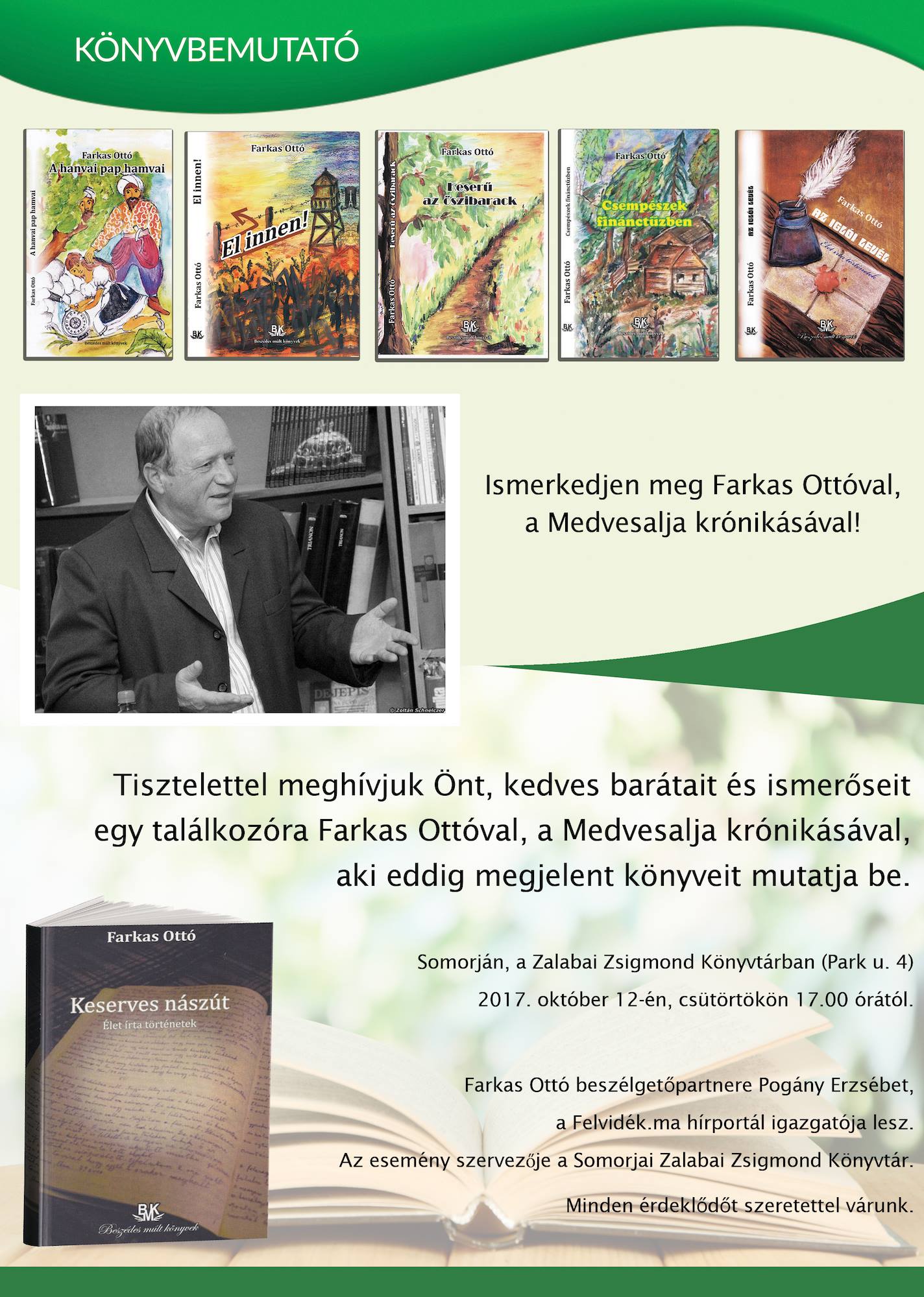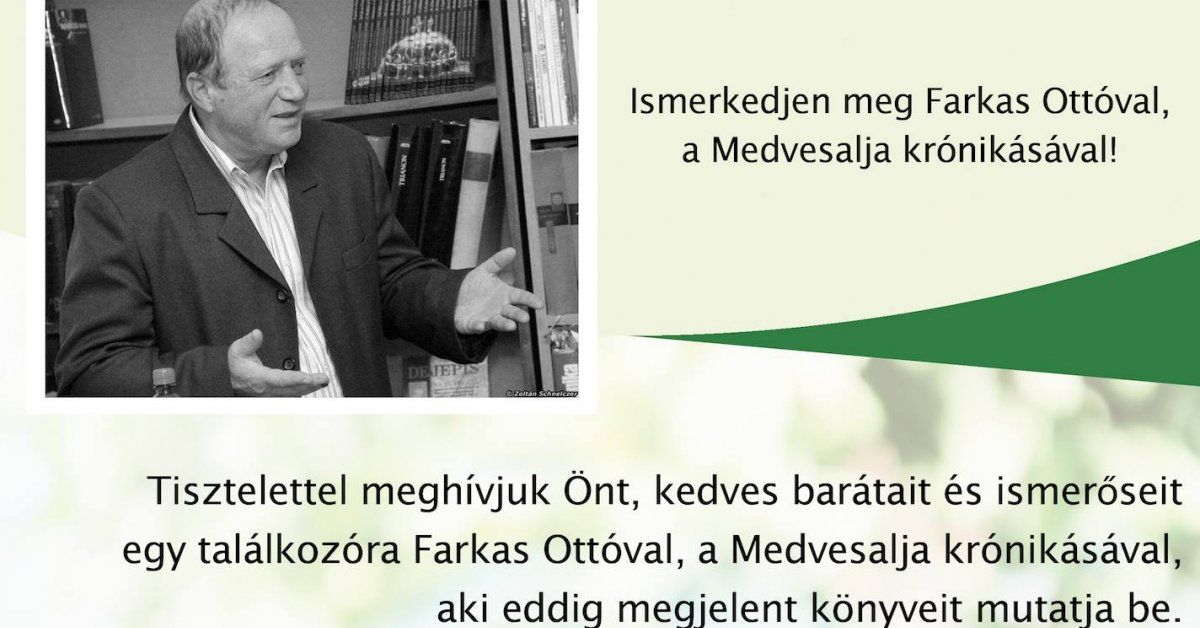 Tisztelettel meghívjuk Önt, kedves Barátait és ismerőseit egy találkozóra Farkas Ottóval, a Medvesalja krónikásával, aki eddig megjelent könyveit mutatja be.