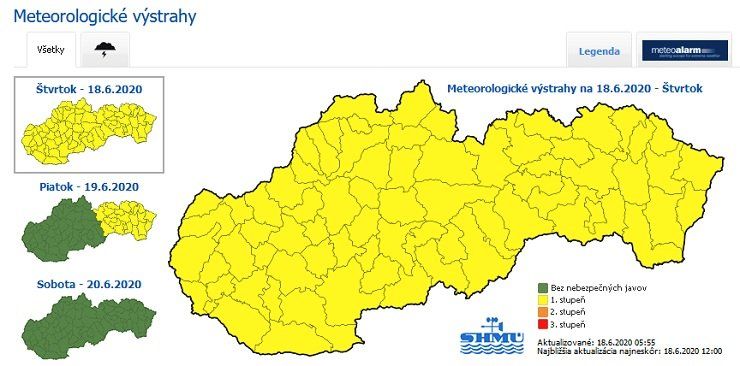A Szlovák Hidrometeorológiai Intézet (SHMÚ) a várható viharok miatt elsőfokú figyelmeztetést adott ki csütörtökre. Ezekre 12:00 és 20:00 között kell számítani az ország egész területén – tájékoztat az SHMÚ a honlapján.