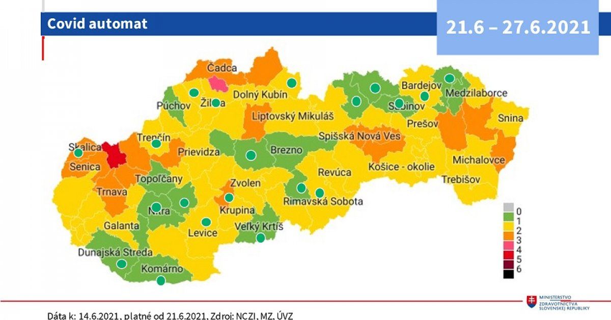 Eszerint a következő héttől mindössze egy piros és egy rózsaszín járás marad. Az előbbi Miava, míg az utóbbi Kiszucaújhely lesz. E kettőn kívül lesz 15 narancs, 45 sárga és 17 zöld járása Szlovákiának.