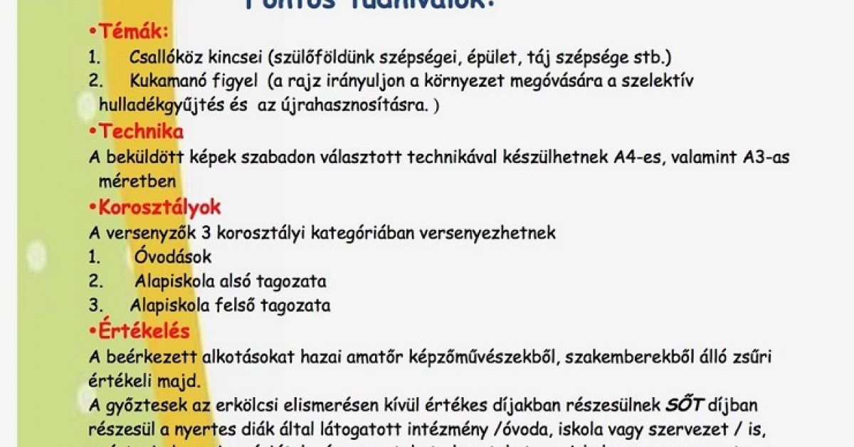 Játékvár Játszóház Csallóközcsütörtök2018.2.5. 14:39Sill ZsuzsaKedeves gyerekek, szülők, pedagógusok!Ismét meghirdetjük a Rajzolj és nyerj ! rajzversenyünket. Bízunk benne, hogy az idén is sokan bekapcsolódtok és sok szép alkotás érkezik majd hozzánk.Megosztás: