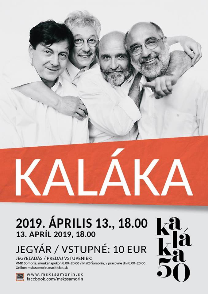 Jöjjenek el április 13-án a 18.00 órakor kezdődő Kaláka 50 koncertre a somorjai VMK-ba! A jegy csupán 5,00€, ezt elővételben a VMK irodáiban, jegypénztárában vagy online a https://mskssamorin.maxiticket.sk/ címen vásárolhatják meg.