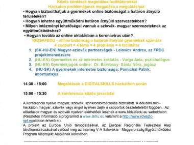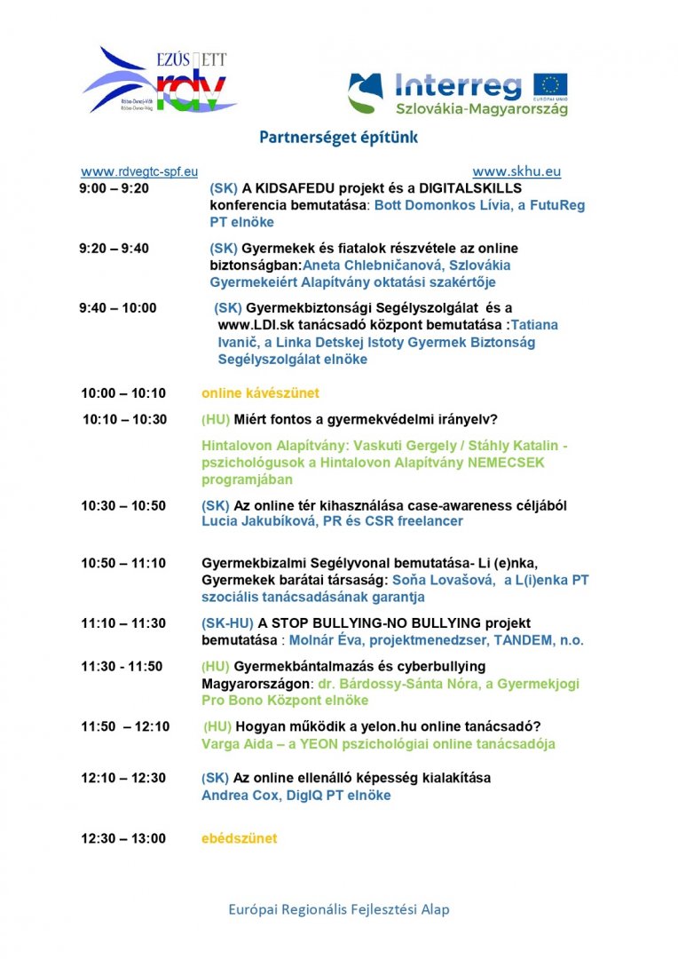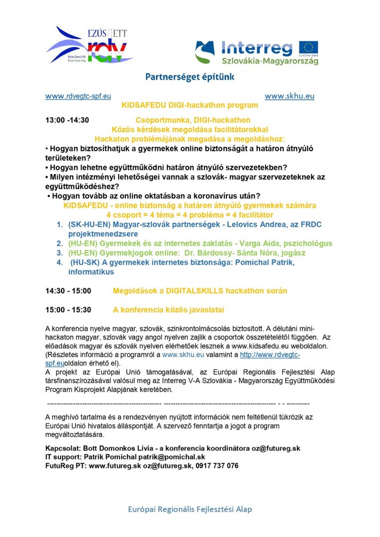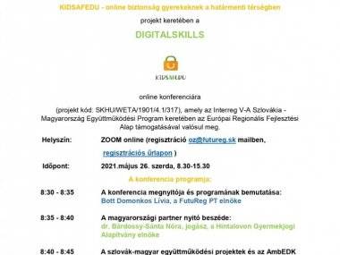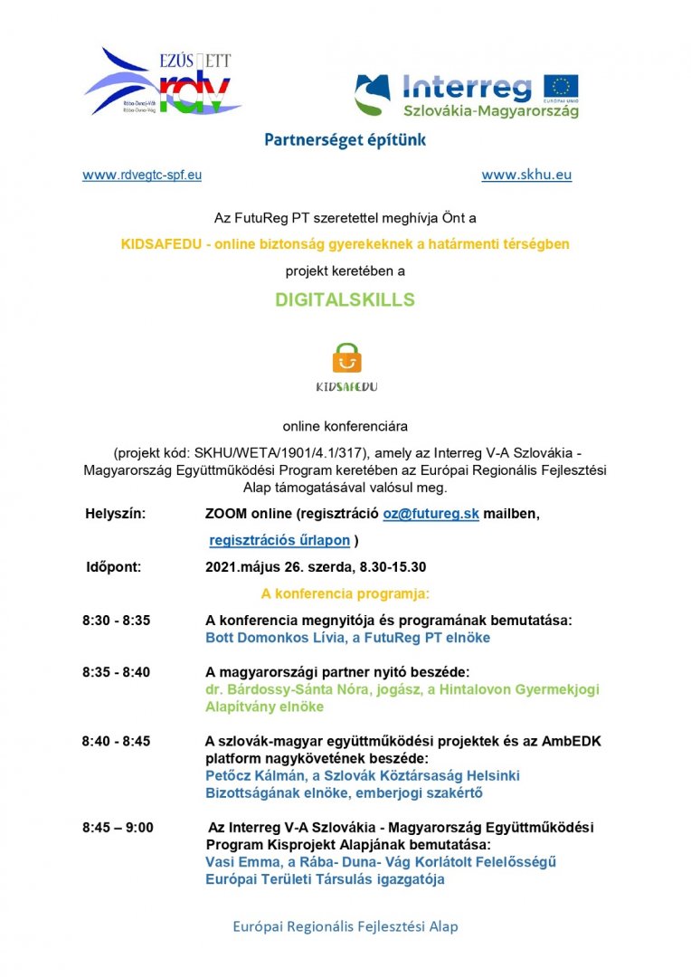 A projekt főszervezője a FutuReg PT, ahogy a www.kidsafedu.eu weboldal is, valamint a maga a konferencia a következő kérdésekre keresi a választ: Hogyan lehet biztosítani a gyermekek online biztonságát egy határon átnyúló területen? Hogyan lehet együttműködni egy határon átnyúló területen? Milyen intézményi lehetőségei vannak a szlovák és a magyar szervezetek együttműködésének. Hogyan lehet biztonságosan haladni az online oktatásban a koronavírus okozta válság után? A rendezvény programja az RDV ETT Kisprojekt Alapjának, a szakmai partnerek, a konferencia résztvevőinek, a KIDSAFEDU projekt rövid bemutatására ad teret és a DIGITALSKILLS konferencia a célok feltérképezésére ad lehetőséget.