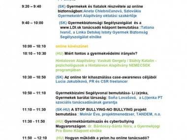 A szakmai konferencián a témában jártas szlovák nonprofit szervezetek szakértői vesznek részt, mint pl. a Szlovákia Gyermekeiért Alapítvány, akik a gyermekek és fiatalok részvételével foglalkoznak az online biztonság terén előadásukban, valamint a Gyermekbiztonsági vonal, ahol Tatiana Ivanič, az LDI n.o. elnöke ismerteti nézeteit. Arra is válaszol a konferencia, hogy miért fontos a gyermekek védelméről szóló irányelv, és hogyan lehet az online teret felhasználni esettudatossági és támogató tevékenységekre. A Gyermekbarátok Társaságát a Li(e)nka és a Gyermekbiztonsági vonal vezetője Soňa Lovašová mutatja be.  A Tandem pedig bemutatja a Stop bully – No bullying projektet. A magyar projektpartner a magyarországi cyberbullyingról és internetes zaklatásról fog beszélni, valamint arról, hogyan működik a yelon.hu online tanácsadó központ és szó esik az online ellenállóképesség kiépítéséről is.