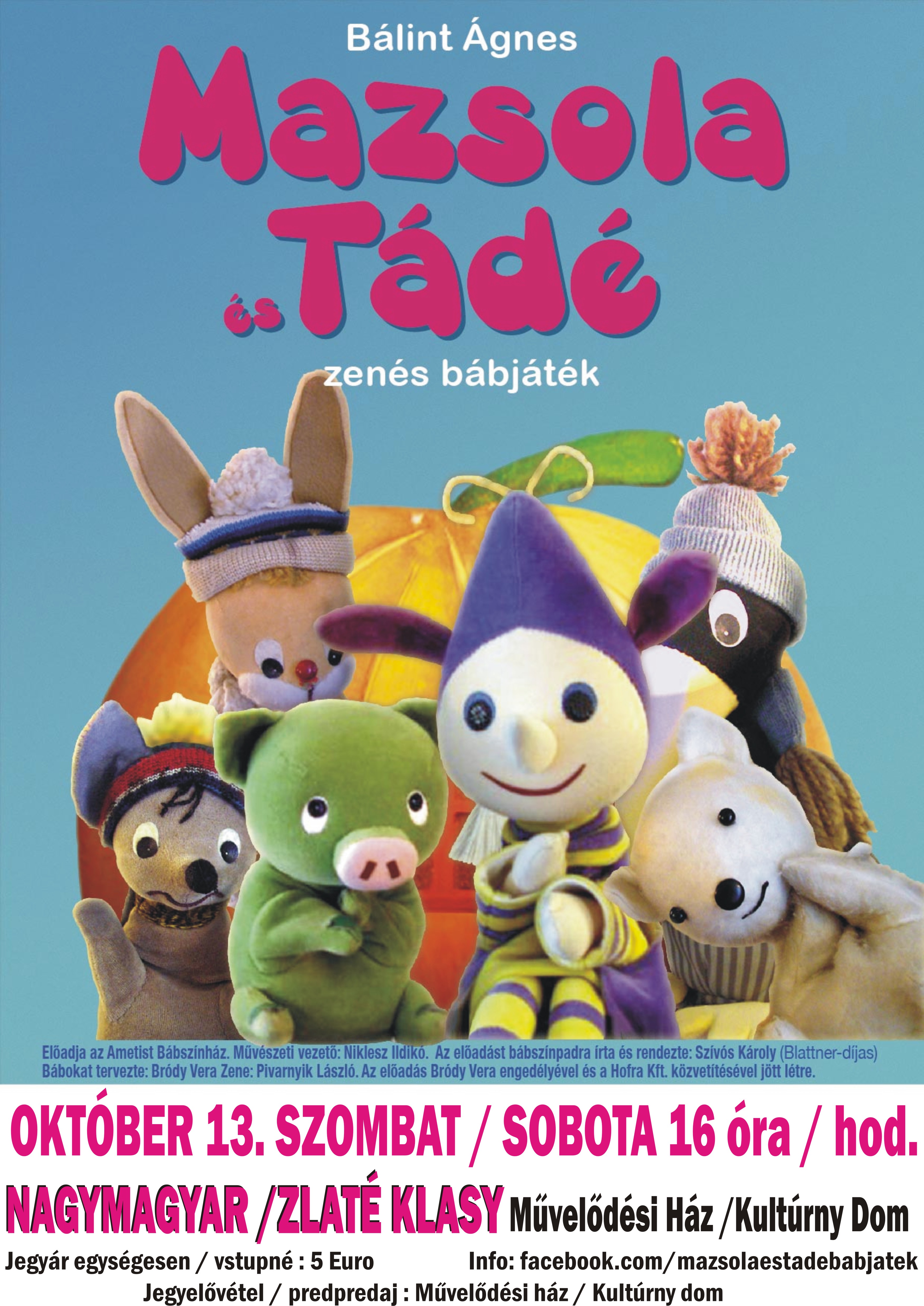 A gyermekek és a gyermeklelkű felnőttek számára nincs is annál nagyobb csoda, mint mikor egy báb életre kel, és kalandjaival elvarázsol. Hát még ha ez a báb egy szeretetre méltó pöttöm kismalac, aki nagy lélekkel és sok-sok érzelemmel van megáldva. Mazsola és barátai: Tádé, Manócska és a többiek, ezúttal a nagy magyari Művelődési Ház színpadán kelnek újra életre.