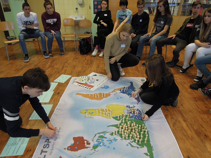 2018.december 7-én került sor az első workshopra, amelyen Jana Teynor, a Südwind szervezet alsó-ausztriai munkatársa foglalkozott a diákokkal. Az egész délelőttöt kitöltő foglalkozás próbára tette a diákok földrajzi, történelmi és nem utolsó sorban német nyelvi tudását, hiszen a közös és csoportmunka is ezen a nyelven zajlott.