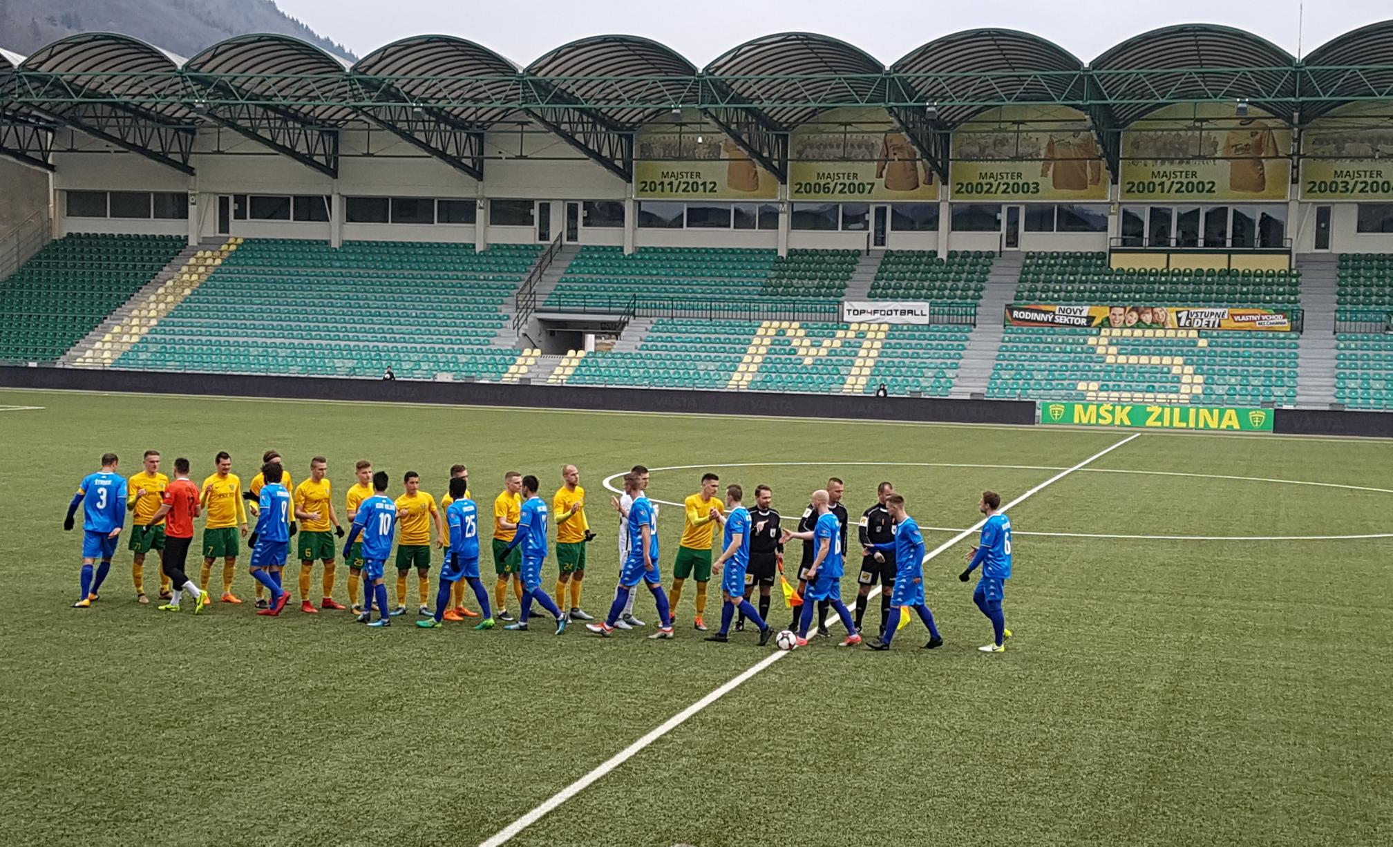 Vendéglátóink csak a nevükben viselték a tartalékcsapat megnevezést. Ugyanis a válogatott szünet miatt több játékost küldtek pályára az első gárda keretéből.Az első félidőben változatos, kiegyenlített volt a küzdelem. Első nagy helyzet előttünk adódott, amikor Fernando szöktette Christiant, akinek helyezett lövését a hazai kapus bravúrral védte. Továbbra is mi veszélyeztettünk, de Nascimento ejtése majdnem becsúszott a kapuba.A 19.percben a hazaiak kerültek nagy helyzetbe, amelyet kihagytak. Ellentámadásból Fujak Šmehylt indította, de ő centiméterekkel mellé lőtt. Majd hatékonyságból kaptunk leckét, mert tétováztunk a labda elfejelésével, ezt használták ki a zsolnaiak első góljuk megszerzésére -- 1:0.