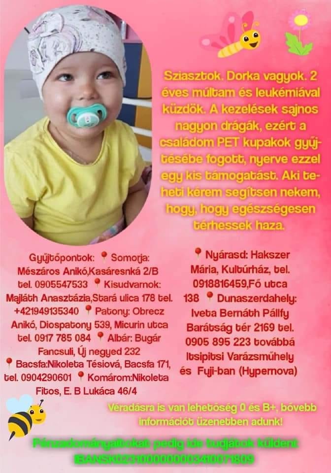 A kétéves dunatőkési kislány, Dorka leukémiával küzd. Orvosi ellátásának lényegi részét az egészségbiztosító téríti, de mivel a kezelés megfelelő körülményeinek biztosítása, valamint a gyógyuláshoz elengedhetetlen speciális otthoni környezet kialakítása és fenntartása nemcsak folyamatos odafigyelést igényel, hanem jelentős anyagi terhekkel is jár, a család kupakok gyűjtésébe fogott. Arra kérik az embereket, aki teheti, segítsen, hogy a kislány egészségesen térhessen haza.