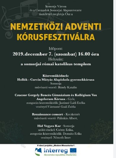 Nemzetközi adventi kórusfesztivál2019.12.5. 09:00Zsuzsanna SillSzombaton december 7-én a somorjai római katolikus templomban 16 órától nemzetközi kórusfesztiválra kerül sor.A hazai fellépők, mint a Híd Vegyeskar és a Corvin Mátyás Alapiskola gyerekkórusa mellett, győri és kecskeméti kórusok is fellépnek.A szervezők sok szeretettel várnak minden érdeklődőt.Megosztás: