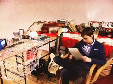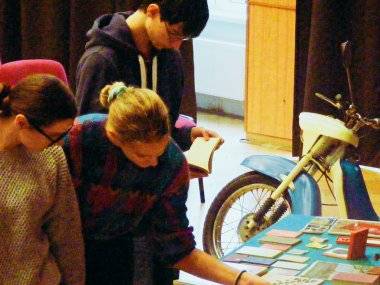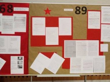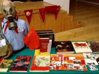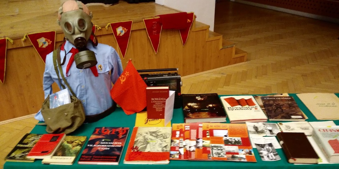 Amint beléptünk a díszterembe, sajátos hangulat fogadott bennünket, mintha az időgép több évtizeddel visszarepített volna. Ugyanis a falakon a letűnt rezsim jelképeivel szembesültünk, a polcokon pedig olyan tárgyak sorakoztak, amelyeket a diákok hazulról, jórészt nagyszüleiktől hoztak el. Láthattunk különböző, ötágú vörös csillaggal ellátott kitüntetéseket, egykori írógépet, különböző tárgyakat, korabeli fotókat, iratokat, még párttagkönyvet és régi Jawa motorkerékpárt is.