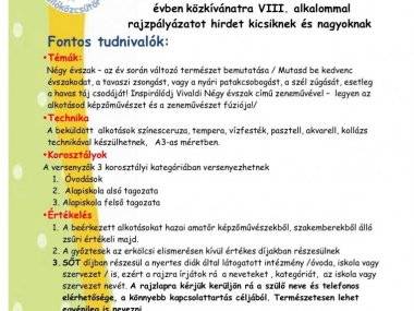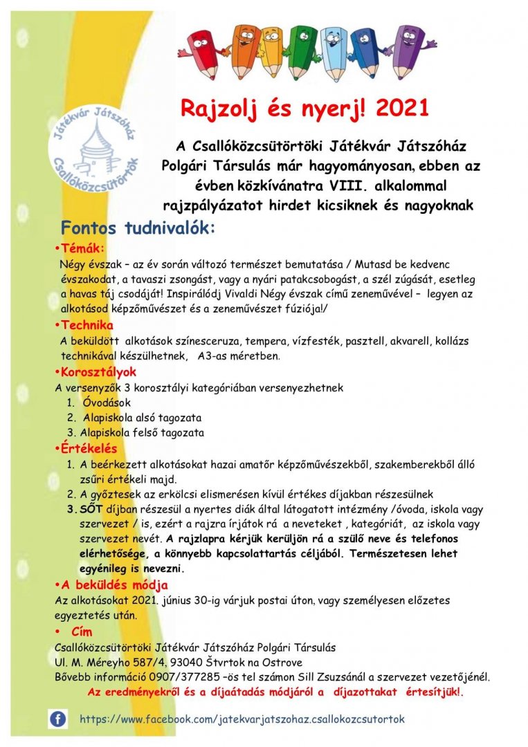 Rajzolj és Nyerj! 2021 Sokan kérdeztétek, érdeklődtetek így közkívánatra VIII. alkalommal hirdetjük meg a rajzpáyázatot. Téma a Négy évszak, ispirálódjatok Vivaldi azonos című zeneművével. Az alkotásokat három korcsoportban várjuk- óvodások, alsósok, és az alapiskolák felsőtagozatos diákjainak munkáját. Természetesen speciális iskolák, valamint a művészeti alapiskolák diákjainak alkotását is szeretettel várjuk. Pályázni iskola vagy egyéb intézmény keretén belül van lehetőség, de szeretettel fogadjuk az egyéni alkotók munkáját is. A pályaműveket 2021. június 30-ig várjuk a plakáton feltüntetett címre. Jó alkotást!